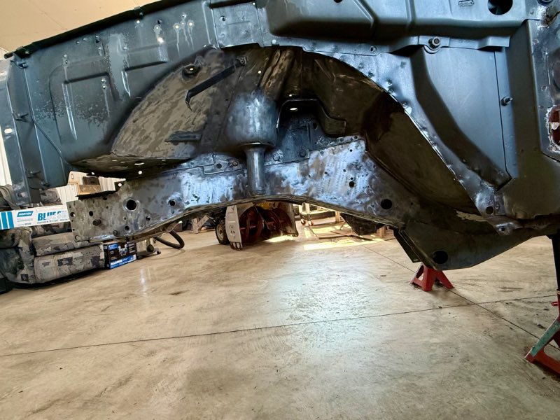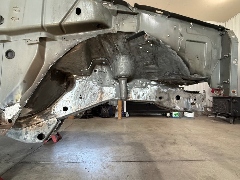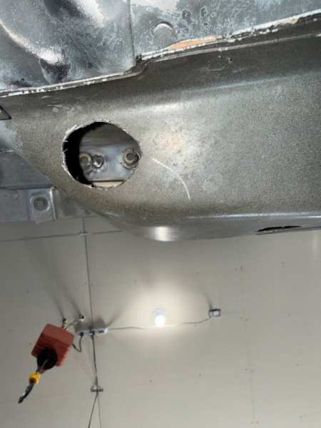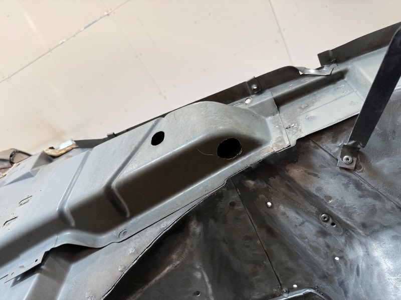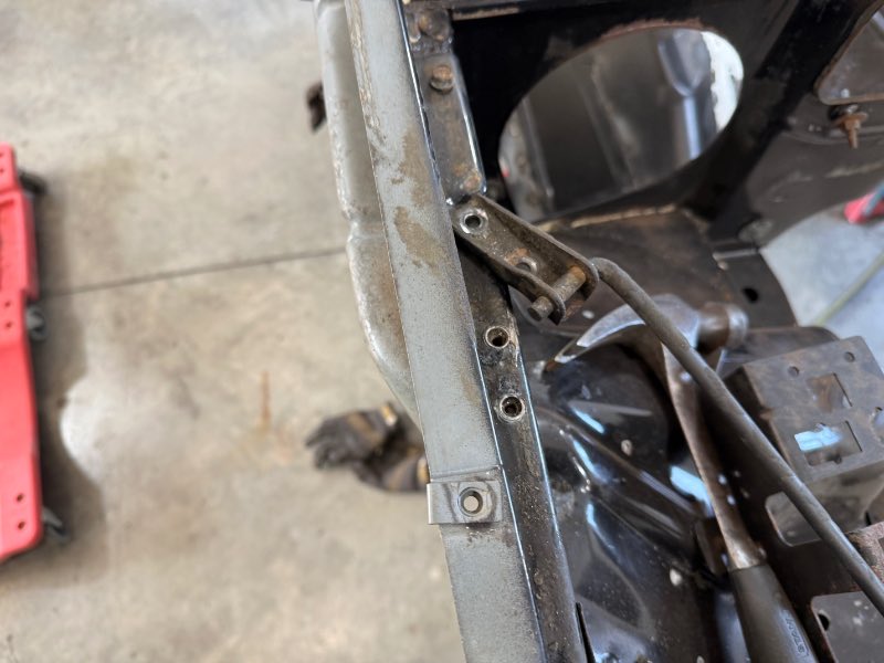 Front wheel well done What to do when you really want to take off your hood prop rod and the nut underneath are spinning free and there is no acces to them . Drill a hole big enough to get your welder nuzzle and tack them in place Job done