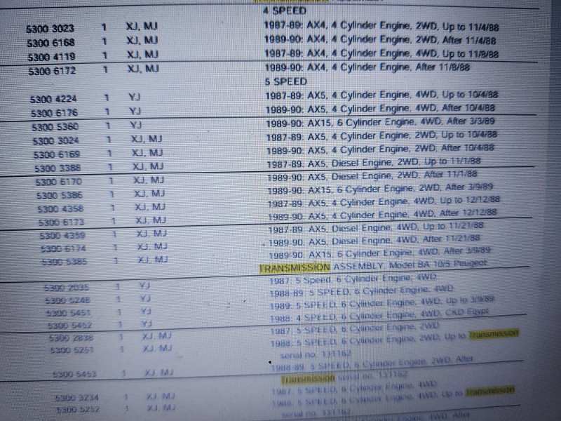 robfg67 Posted Monday at 06:00 PM Share Posted Monday at 06:00 PM I have a 1988 MJ with the 2.5L, the 5-Speed Manual AX5, and it is 2WD. From looking through the factory parts manual, it appears that the AX5 transmission for my application changed on 10/4/88 and I'm not sure of the build date of this Jeep. This transmission was used on all MJ's and XJ's from 87-90, but there are two different ones used. Questions: 1. Would it matter which version I sourced? Are they interchangeable? How can you tell what the differences are? 2. My '88 is 2WD. Does it matter if I get a replacement one that was mated to a transfer case? Thanks Link to comment Share on other sites More sharing options...
